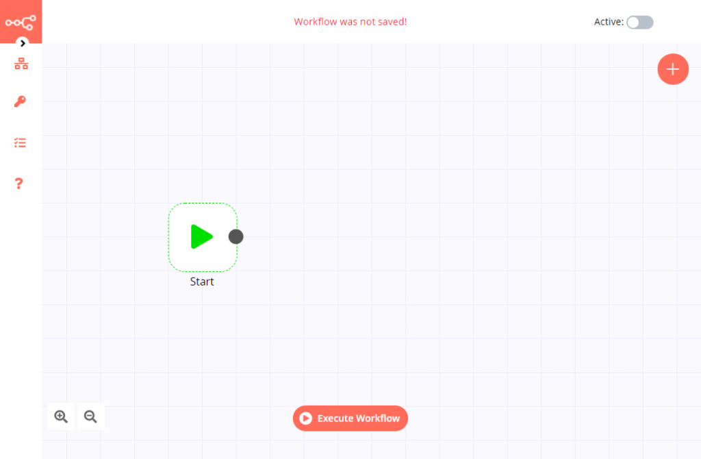 n8nを起動して設定したドメインにアクセスすると上記の画像のようなページが表示されます。こちらがn8nのメイン画面になっています。画像真ん中らへんに表示されているStartのノードが初期フローの開始地点となっています。