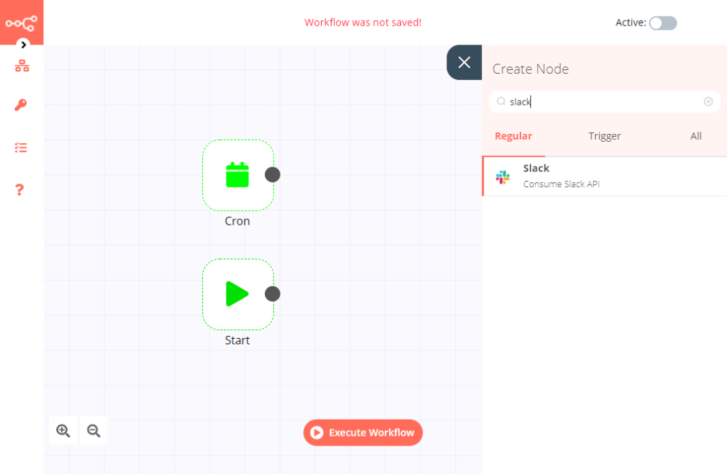 次にSlack投稿をしてもらうためSlackのノードを追加します。先ほどと同じようにノード追加画面を開き、今度は「Regular」の項目からSlackのノードを追加します。今回はSlackのAPIキーを取得するところは省略しますが、APIキーの設定、チャンネルと送信するテキストの設定で追加完了です。